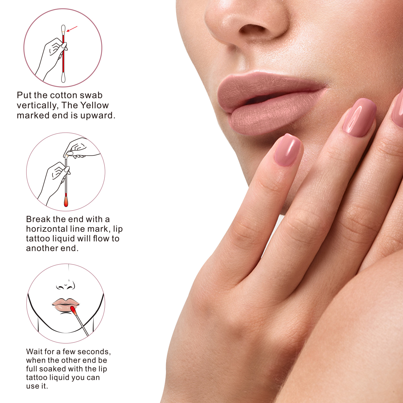 【How to use】 Split the cotton swab along the side marked by the horizontal line of the cotton swab, and let the cotton swab stand upright to allow the liquid to flow to the other end (this process is about 2 seconds, be careful not to drip onto your hands the first time you use it) , Use a cotton swab to evenly fill the upper and lower lips.